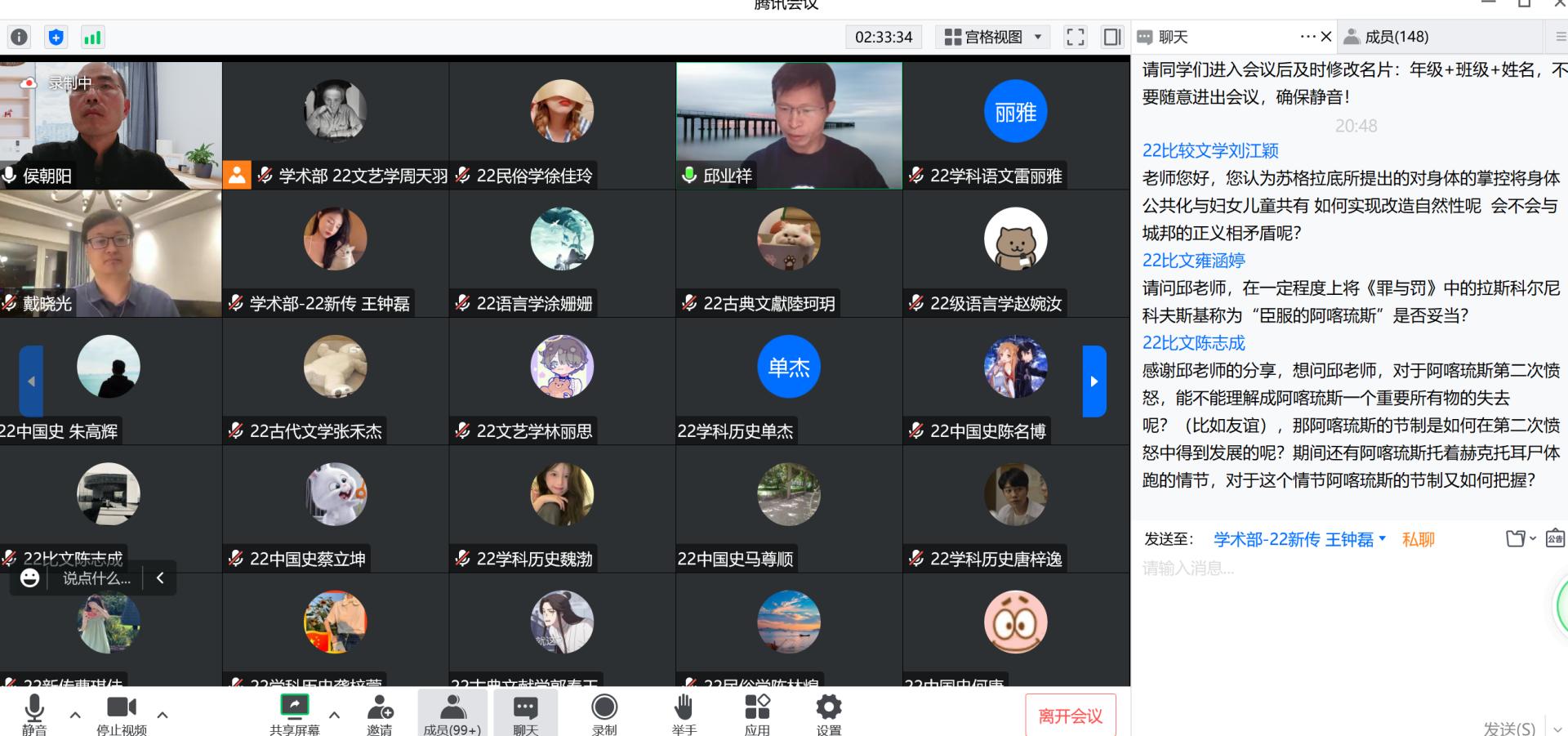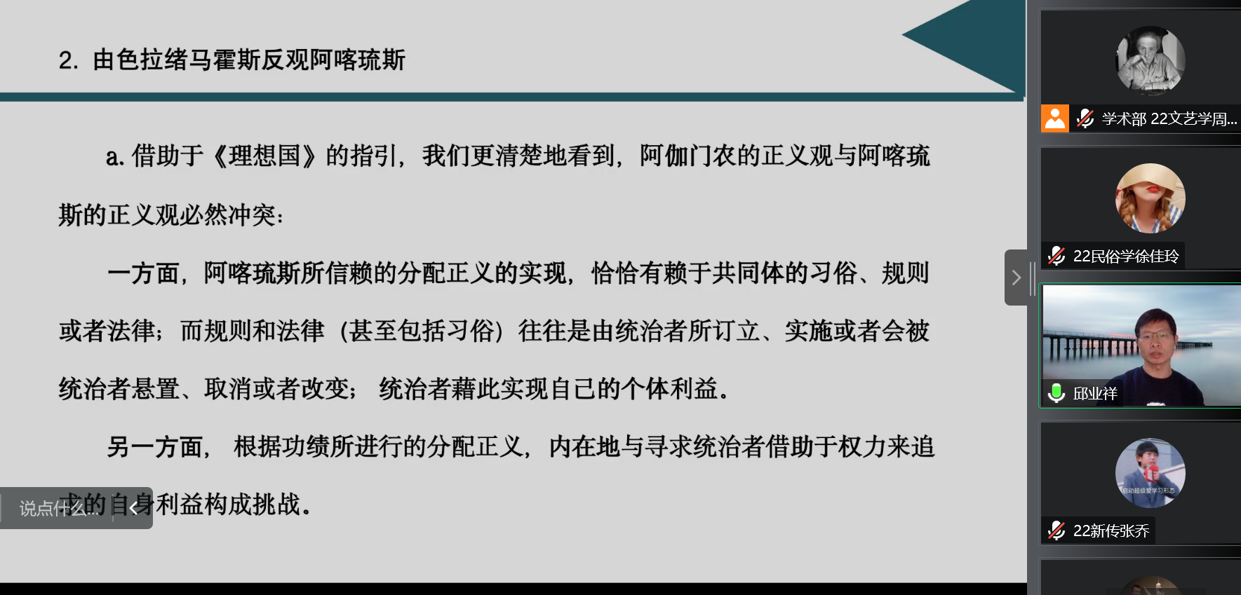 2022年11月4日19点,河南大学文学院教授、博士生导师邱业祥老师受邀为新葡萄官网师生带来了一场题为“苏格拉底论阿喀琉斯——以《理想国》为中心”的精彩讲座。讲座由侯朝阳老师主持,中国人民大学文学院青年教师戴晓光博士参与对谈。