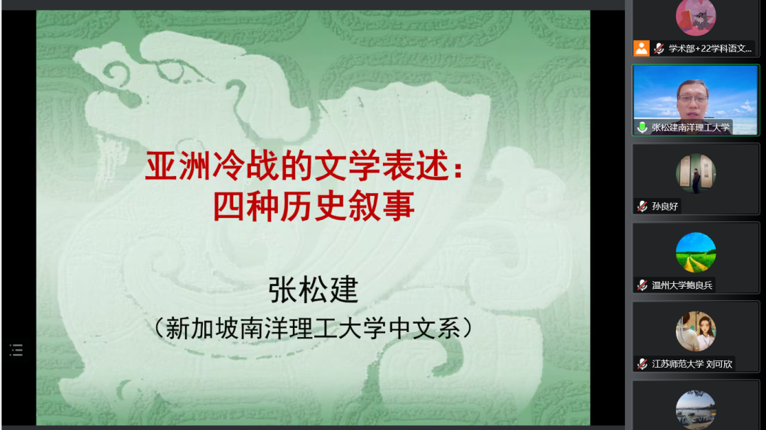 2022年11月19日14:30,新加坡南洋理工大学中文系终身职副教授,博士生导师张松建老师受邀为新葡萄官网师生带来了一场题为“亚洲冷战的文学表述:四种历史叙事”的精彩讲座。本次讲座由新葡萄官网孙良好院长主持,鲍良兵副教授及校内外众多师生参与本次讲座。