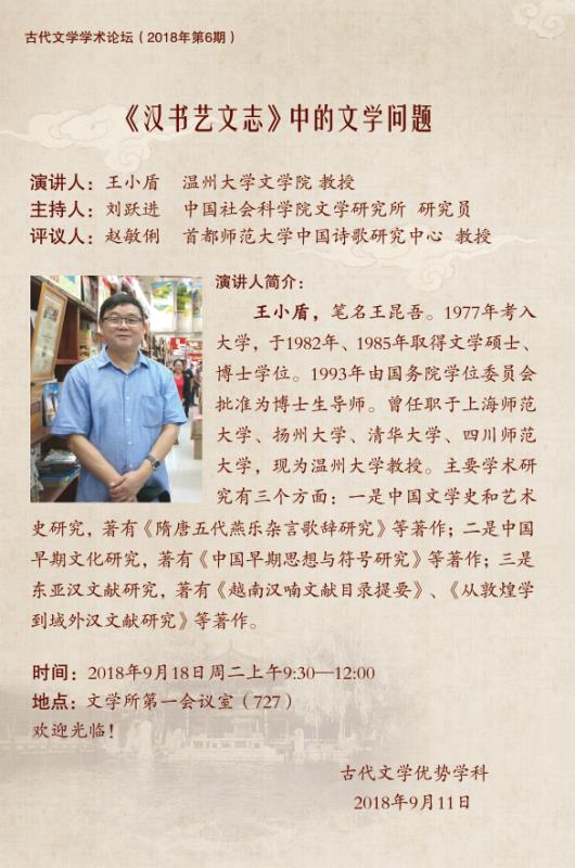 9月18日,对于中国人来说,今天是一个特殊的日子:勿忘国耻,铭记历史。对于新葡萄88805官网来说,今天也是一个值得书写的历史。今天上午9:30-12:00,新葡萄88805官网特聘教授王小盾在中国社会科学院文学所第一会议室主讲古代文学学术论坛第6期 《<汉书艺文志>中的文学问题》。今天下午4:00~5:30王小盾教授将在北京大学人文学苑6号楼B124会议室作题为《从越南的四所寺院看东亚汉籍的生存》的主题报告。今晚19:30开始,中国红楼梦学会常务理事饶道庆教授将在北京的恭王府开讲《“正邪两赋”话宝玉》,这是北京青年报"青睐"线下活动携手恭王府举办"走进红楼梦中人——恭王府与《红楼梦》“主题系列讲座的第四场。