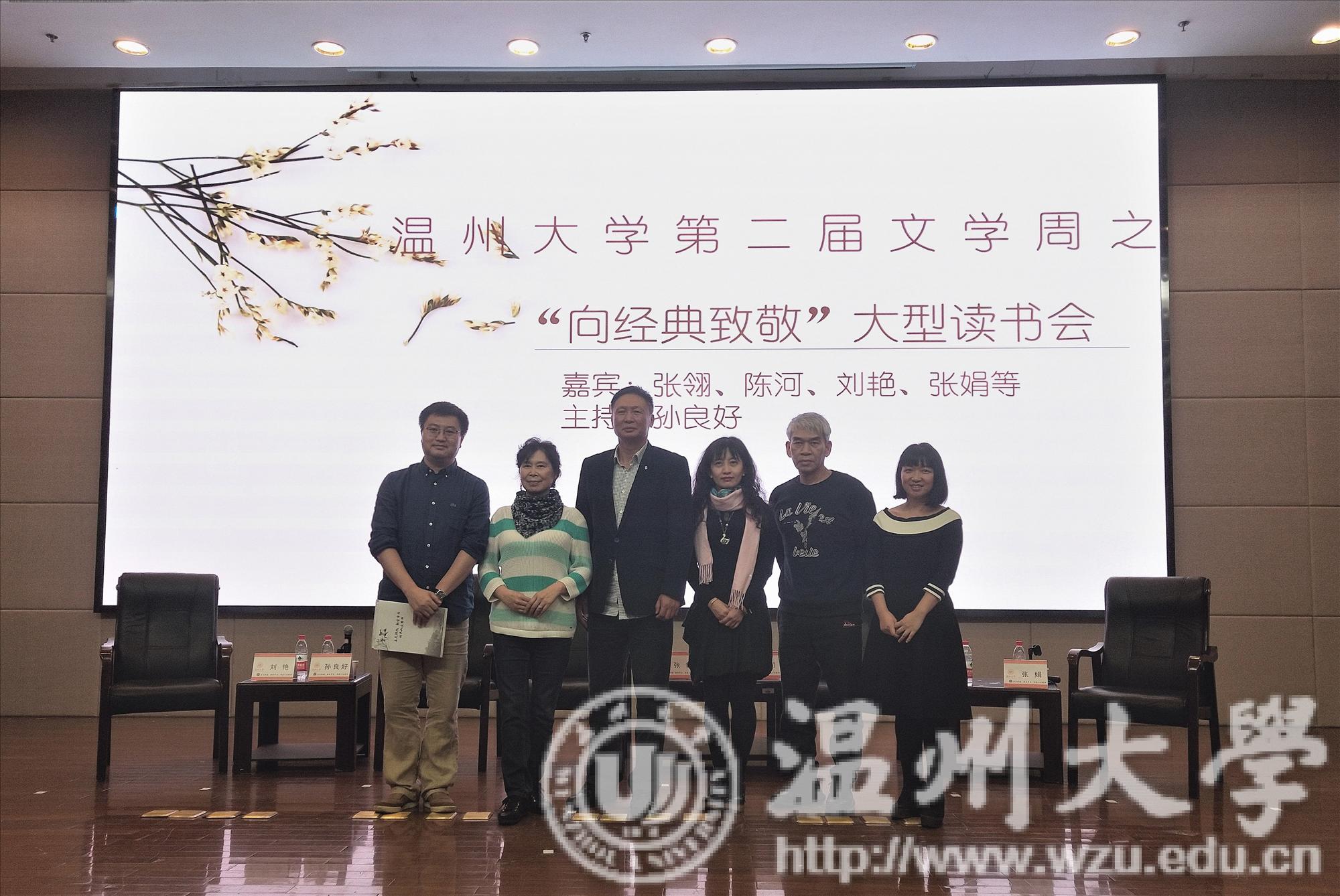 2018年11月15日18时30分,我校第二届文学周之“向经典致敬”大型读书会于育英图书馆学术报告厅举行。本次活动由新葡萄官网院长孙良好主持,驻校作家张翎、海外华人文学作家陈河、中国社会科学院博士刘艳、东南大学新葡萄88805官网副教授张娟以及当代著名作家王手受邀参加本次活动。