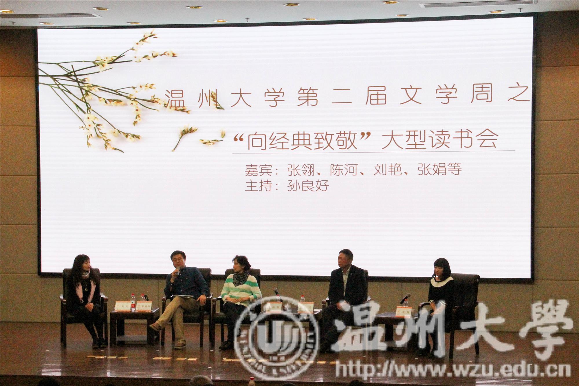 活动开始后,孙院长向我们隆重介绍了五位嘉宾,并提出在这个众声喧哗、浮光掠影的社会里,我们要沉下心来阅读经典。之后,各位老师以“读经典的必要性”为主题展开了讨论。孙院长提出:“阅读经典就是‘无用而自有为‘,年少时应该博览群书、披沙拣金。”张翎通过她年轻时的经历告诉我们:“经典是年轻时营养的钙片”,形象地解释了人与经典的关系并告诉我们要学会与经典对话。随后,刘艳告诉我们文化素养的养成应该从阅读经典开始,她以沈从文的《边城》和萧红的《呼兰河传》为例,教导我们读经典不能教科书式的阅读,要回到原作、现场以及作者的人生经历来感受一个作家写作的变化。紧接着,陈河语重心长地告诉我们读经典要从年轻开始,投入全部精力去读自己喜欢的经典。张娟着重讲述生命哲学,通过生命哲学启示我们每一个个体去发现经典,面对自己、享受孤独之美。