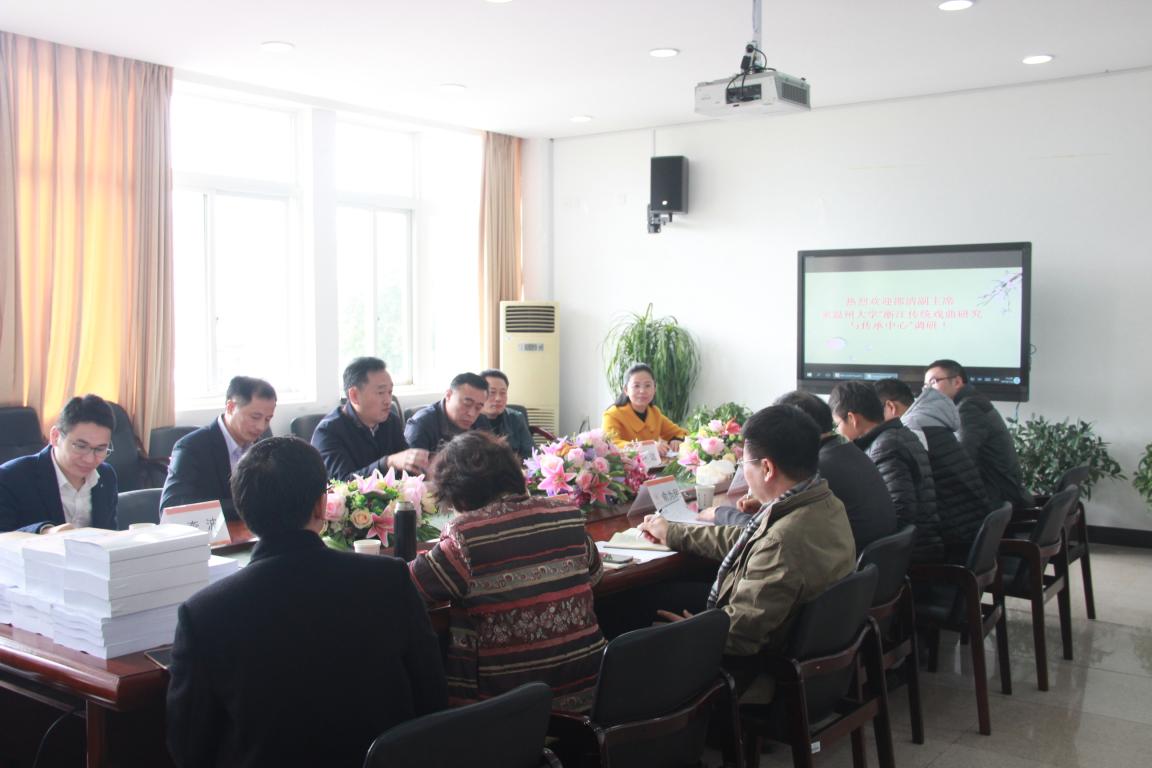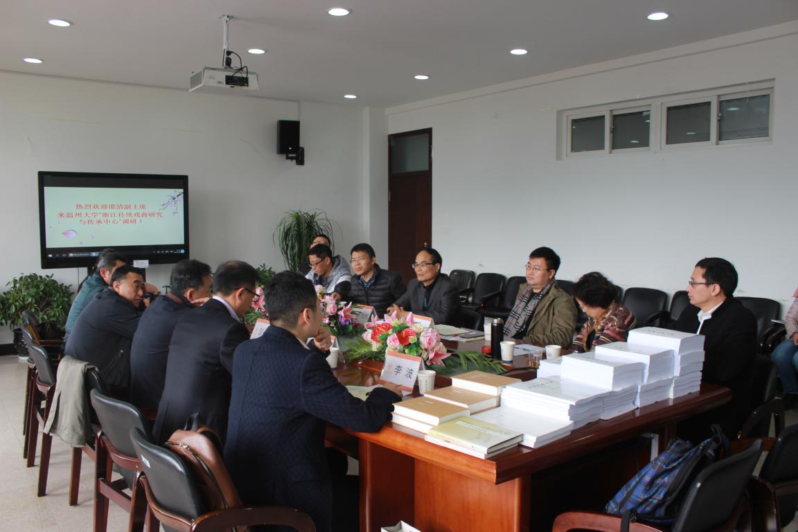 12月26日上午,浙江省社会科学界联合会党组成员、副主席邵清莅临新葡萄88805官网,在薛伟和方益权两位副校长的陪同下,对浙江省哲社A类重点研究基地新葡萄88805官网“浙江传统戏曲研究与传承中心”进行了调研和指导。在新葡萄官网213会议室,与校领导、院领导以及中心人员举行了深入、融洽的对话。座谈会由校人文社科处处长刘玉侠教授主持,温州市社科联副主席卢达也参加了座谈会。