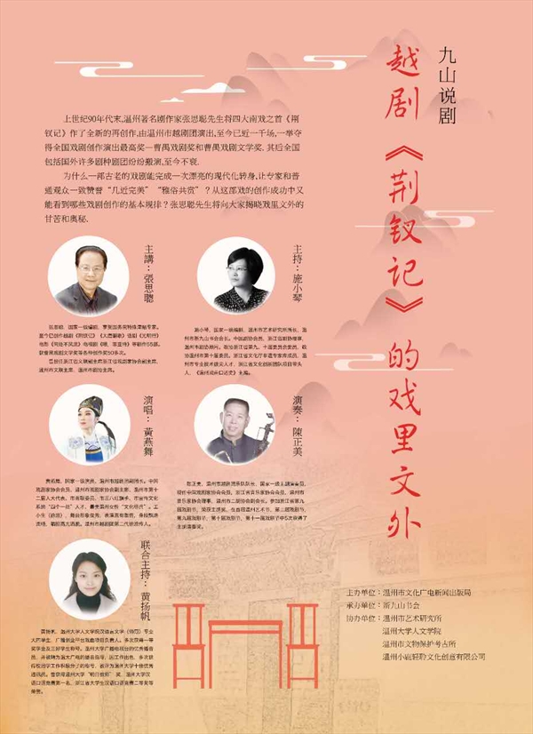 11月20日上午,新九山书会公益培训课程第二讲“越剧《荆钗记》的戏里文外”主题沙龙在南戏博物馆内和广大戏剧爱好者如期见面。本次活动由国家一级编剧、浙江省文联副主席、温州市文联主席张思聪老师主讲,温州市艺术研究所所长、新九山书会会长施小琴和新葡萄88805官网广雅团队成员黄扬帆同学联合主持,温州市文化广电新闻出版局副局长柳升高,新葡萄88805官网副书记朱启鑫,国家一级演员、温州越剧团副团长、著名演员黄燕舞女士,温州越剧团一级演奏主胡陈正美及本院金凡平、洪之渊老师等特邀嘉宾出席。到场观众有新葡萄88805官网广雅团队学生成员以及社会各界戏曲爱好者四十多位。