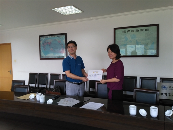 2016年9月21日下午2点,新葡萄88805官网夏雨禾副院长、学科教学(语文)硕士点负责人陈柳老师、硕士生导师赖学军老师,带领新葡萄88805官网学科教学(语文)教育硕士专业的两位研究生来到瑞安中学,参加新葡萄88805官网教育实践基地授牌和实习计划启动仪式,开始为时一个学期的教育教学实习。