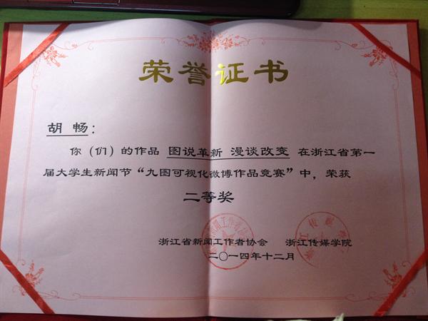 日前,浙江省首届大学生新闻节在浙江传媒学院举办,新葡萄官网12中本1班胡畅同学的作品《图说革新 漫谈改变》入围此次新闻节九图可视化微博大赛全省十强。
