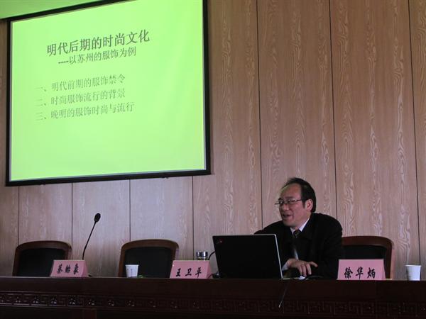 王教授首先从明朝前期颁布的服饰禁令切入,为同学们介绍了“四方平定巾”、“六合一统帽”等极具特色的服饰,再通过展示明代文武官员的官服以及庶民服饰来分析它们的实用价值和审美意义,并揭示了这一时段服饰的等级意义及其背后所反映出的国家与民族的意义。尔后,他从明朝后期朝政的消极、商品经济的发展等角度剖析了晚明时尚服饰流行的背景,进而解读出时尚风气流行的“僭越礼制、崇尚古风、追新求奇”等特点。王老师不仅以诙谐、风趣的语言解释了“苏意、苏样、服妖”等新名词,而且用翔实的史料、专业的术语和清晰的思路,图文并茂地论证了晚明时期苏州作为全国时尚文化策源地的地位与影响。