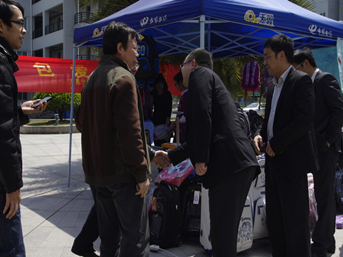 而此次义卖,产品种类丰富,包含拉杆箱、登山包、书包、旅行箱等等,同学们踊跃购买,同时也吸引了较多的老师与食堂员工前来集体订购。尽管头顶烈日,我们热情高涨,团结协作,克服了许多突发状况,大家耐心的发传单,给有意向的同学们介绍产品,孜孜不倦。希望通过此次活动,能够传递更多的爱心,帮助更多困难的学生。同学们献爱心的热情高涨,而更多的教职工也加入到爱心行列中来,献出属于他们的一份独特的爱心。在叶豪芳老师的宣传支持下,许多住在C区的教职工纷纷前来捧场,为这次箱包爱心义卖活动增添了一份春天般温煦的风景。