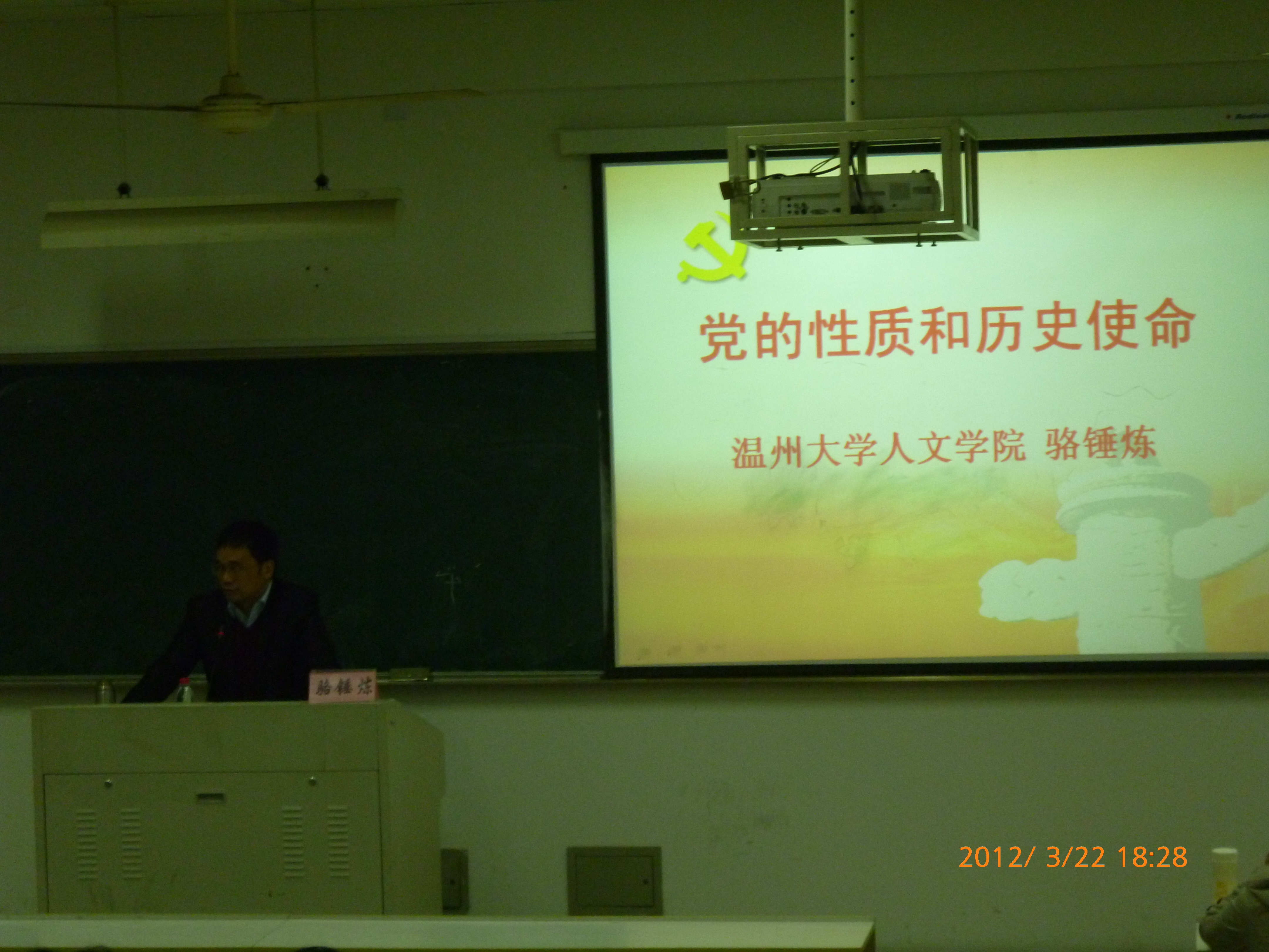 2012年3月22日晚18时30分,新葡萄88805官网第十五期党校培训第二课在1-301开课。新葡萄88805官网党总支副书记骆锤炼老师作为主讲人出席了本次党课。77名党校的学员和党员之家工作人员积极主动地前来聆听讲座。