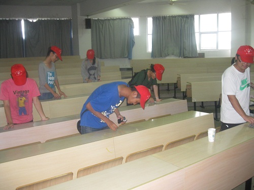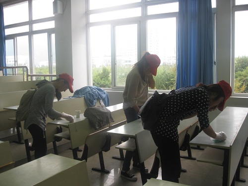 下午1点30分左右,志愿者们的身影便在整栋人文楼忙碌起来。面对课桌上的斑斑字迹,或者同学们的信手涂鸦,志愿者们用软布蘸取适量的香蕉水,“毫不留情”地便将它们通通消灭了。他们按事先分配的任务,在各自“承包”的教室里努力着。秋日的午后仍稍显沉闷,但志愿者们全然不顾刺鼻的香蕉水味道以及偶尔渗出的汗水,全心全意的奋斗在自己的岗位上。大概2小时以后紧张与忙碌得清除工作才结束。望着窗明几净,课桌整齐的教室,大家也忘记了劳动后身上的酸痛,满足地微笑着。