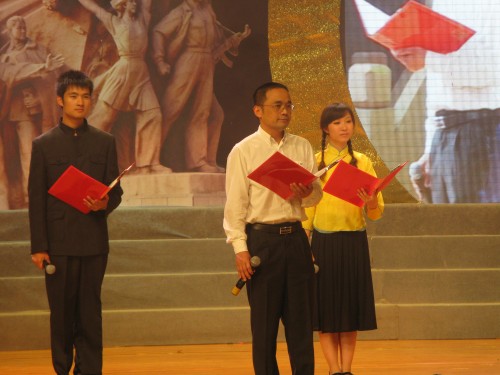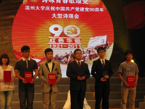 开幕式后举行“诗咏青春歌颂党”建党九十周年大型诗歌朗诵会,全校来自二级学院及部门选送十个朗诵节目恢弘演绎咏志情怀。新葡萄88805官网选送的群颂《我的祖国》以飒爽的英姿亮相舞台,在场师生掌声不断,来自新葡萄官网的80名学生代表高呼“文韬武略,扬我人文”,充分展示了人文学子的良好精神风貌。最后校党委书记陈福生、副书记林娟娟与新葡萄官网党总支副书记骆锤炼老师等全校师生代表共同演绎原创诗朗诵《党建纪元逾九十 歌颂党史唱温大》,令全场激情澎湃、荡气回肠,晚会达到高潮。大会在全场起立齐唱校歌的庄严氛围中,将爱党荣校的精神“润物细无声”深植入了全体温大人的心中。在上周三上演的庆祝建党九十周年诗歌朗诵大赛中,《我的祖国》获得群诵组第二名的好成绩,同时也荣获了“优秀创作奖”奖项。