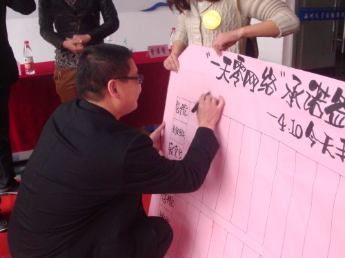启动仪式在这个阴雨天举行,但是坏天气并没有阻挡同学们的热情,会场仍是站满了人。启动仪式伊始,由周剑平老师致辞,在致辞中周老师讲述了互联网对同学们生活的双面影响,希望能够着急更多的同学参加这次活动。接着,王定福老师向大家致辞,并预祝本次主题文化活动能够去的圆满成功。其后,在志愿者代表的带领下,场上志愿者们宣读誓词。接下来就是进入一个轻松环节,新葡萄88805官网3个班级根据本次的“零网络”主题向大家呈现了一场精彩的表演。最后,在场的老师及承诺者在承诺签名榜上郑重写下了自己的名字,至此,本次启动仪式圆满结束。