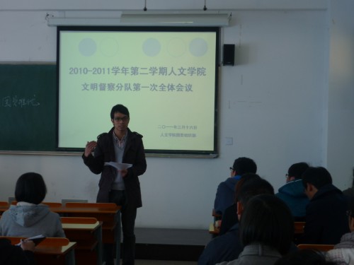 3月16日下午1:30,2010-2011学年第二学期新葡萄88805官网文明督察分队第一次全体会议在1-105教室准时举行。此次会议由新葡萄88805官网团委组织部负责,辅导员麻法全老师出席,文明督察队的各成员参加。
