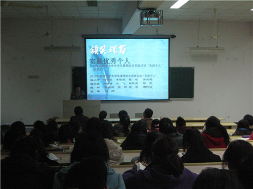 3月13日晚上6点30分,新葡萄88805官网2010年暑期社会实践成果展暨2011年暑期社会实践动员大会于1-203教室举行。出席该大会的有新葡萄88805官网实践中心负责人张建增,新葡萄88805官网辅导员麻法全老师,新葡萄88805官网学生会主席陈辉、团委副书记梅秀娟同学。新葡萄88805官网大一全体同学也准时参加了此次会议。