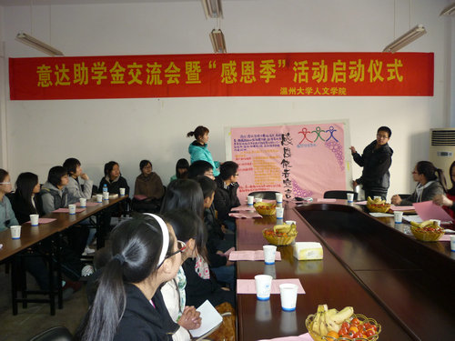 活动伊始,曾老师组织参加人员在人文楼外的草坪种下了“感恩树”。王校长、骆老师和受助学生们一起种下象征顽强和生机的松树,这也表达了受助学生们感恩之心。其后,一行人回到会议室交流助学情况。交流会上,骆老师首先代表学院向意达来访人员表示了热烈的欢迎和感谢并简述了受助学生的基本情况。紧接着,王校长发表讲话,教导在场学生要不怕困难、好好学习、好好生活、学会感恩、回报社会。之后,受助学生们分别讲述了自己在上学期的学习和生活情况,谈了自己在春节的经历并诉说了自己对未来的期望。“小事情里见真情”,这是王校长总结学生发言后的感受。他不仅告诫学生们勤工俭学不能影响学业、学生要以学习为首要目的,而且期望学生们要有更高的道德素养,尊敬师长、帮助他人、做个全面发展的人。随后,在曾老师的主持下,受助学生作为首批感恩使者宣读了感恩宣言,学生代表还向王校长献上鲜花表示敬意。在骆老师和王校长的带领下,全体参加人员都在宣言板上签名,留下了美好回忆。最后,王校长代表意达集团授予学生奖学金。