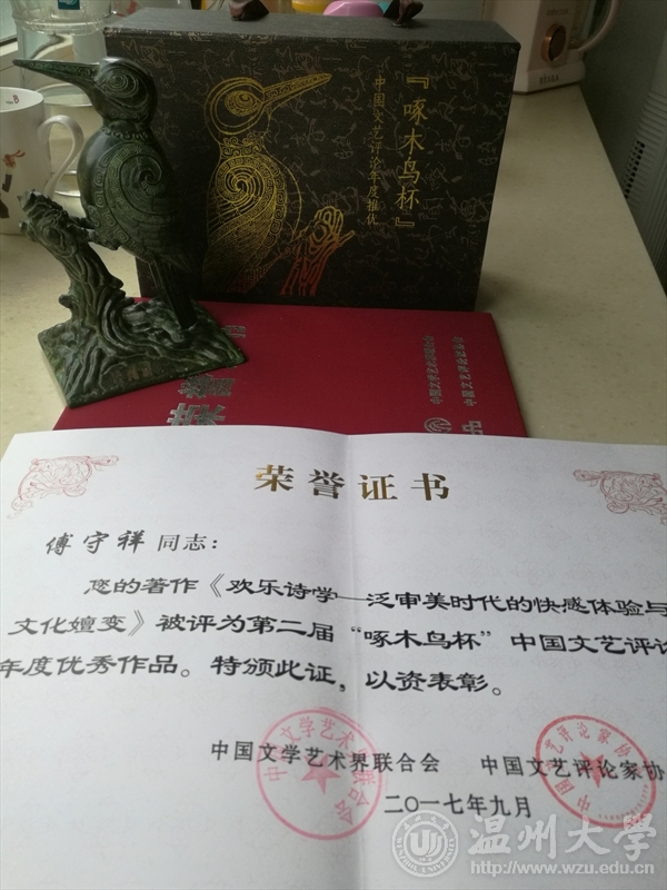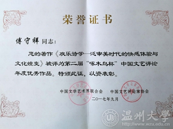 9月26日,由中国文联、中国文艺评论家协会主办的第二届“啄木鸟杯”中国文艺评论2017年度推优活动发布大会在北京中国文艺家之家隆重举行。中国文联党组成员、副主席郭运德、中国文艺评论家协会主席仲呈祥等出席典礼并为获奖者颁发了“啄木鸟”杯和荣誉证书。新葡萄88805官网特聘教授傅守祥的专著——《欢乐诗学:泛审美时代的快感体验与文化嬗变》获评2017年度“中国文艺评论优秀作品”并应邀参加了颁奖典礼。