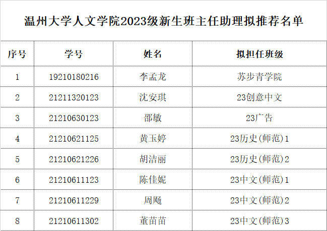 根据学校《关于招募2023级新生班主任助理的通知》要求和相关文件精神,经过学生个人申请、学院初审、公开竞聘等环节,按照专业相近原则,现将新葡萄88805官网2023级新生班主任助理拟推荐名单公示如下。
